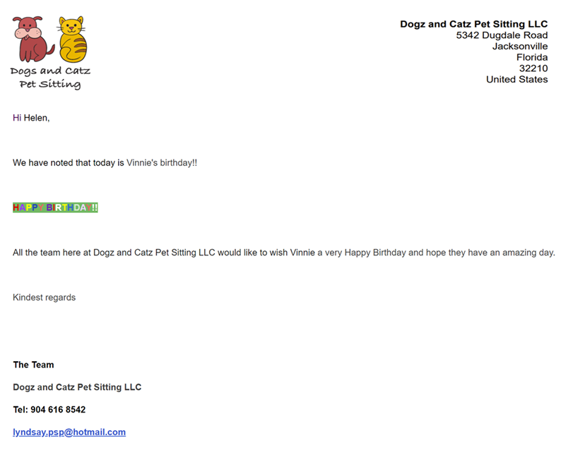 Example of a Pet Birthday Email sent to clients in Cat Sitting Software